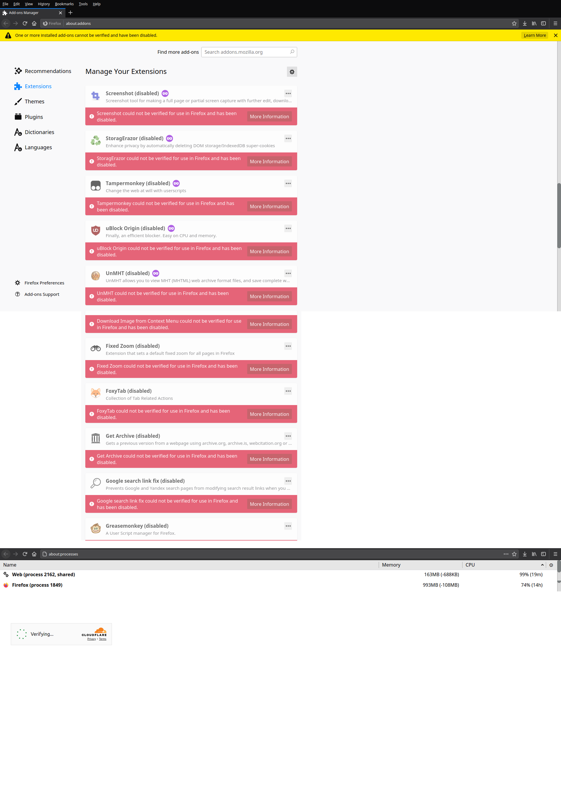 >>24584Меня с последним обновлением Pale Moon перестали пускать на любые сайты, где задействована КлаудФларь. Либо белый экран с бесконечной загрузкой капчи, либо клаудфларья заглушка, показывающая, что браузер у меня работает, клаудфларь работает, но "хост" недоступен. За подробностями предлагают пройти на сайт КлаудФлари, который защищён клаудфларью и не открывается. FireFox пока работает.