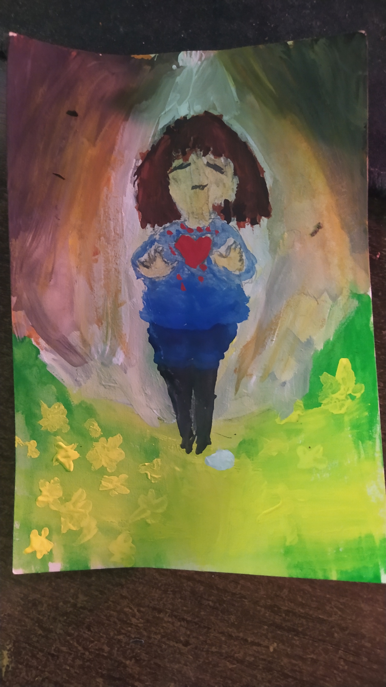 Имота увлеклась Undertale, а мне лишь бы попрактиковаться(красками в первый раз за текущий марафон попыток, вроде пастель). С пропорциями и перспективой снова мрак, но концентрировалась на композиции и (неудачной) попытке в переходе цветов - быстро сохнут краски и непонятно что делать :|Всё ещё хуже уровня школьников, but welp. В оригинале ( https://ih1.redbubble.net/image.688117020.7640/flat,750x,075,f-pad,750x1000,f8f8f8.webp ) шла надпись - попробую её сделать трафаретом из малярного скотча. Пробовала уже буквы кистью выводить... which ended with ought, but tearful mental damage. Почему у нас нет горе-художественного треда?