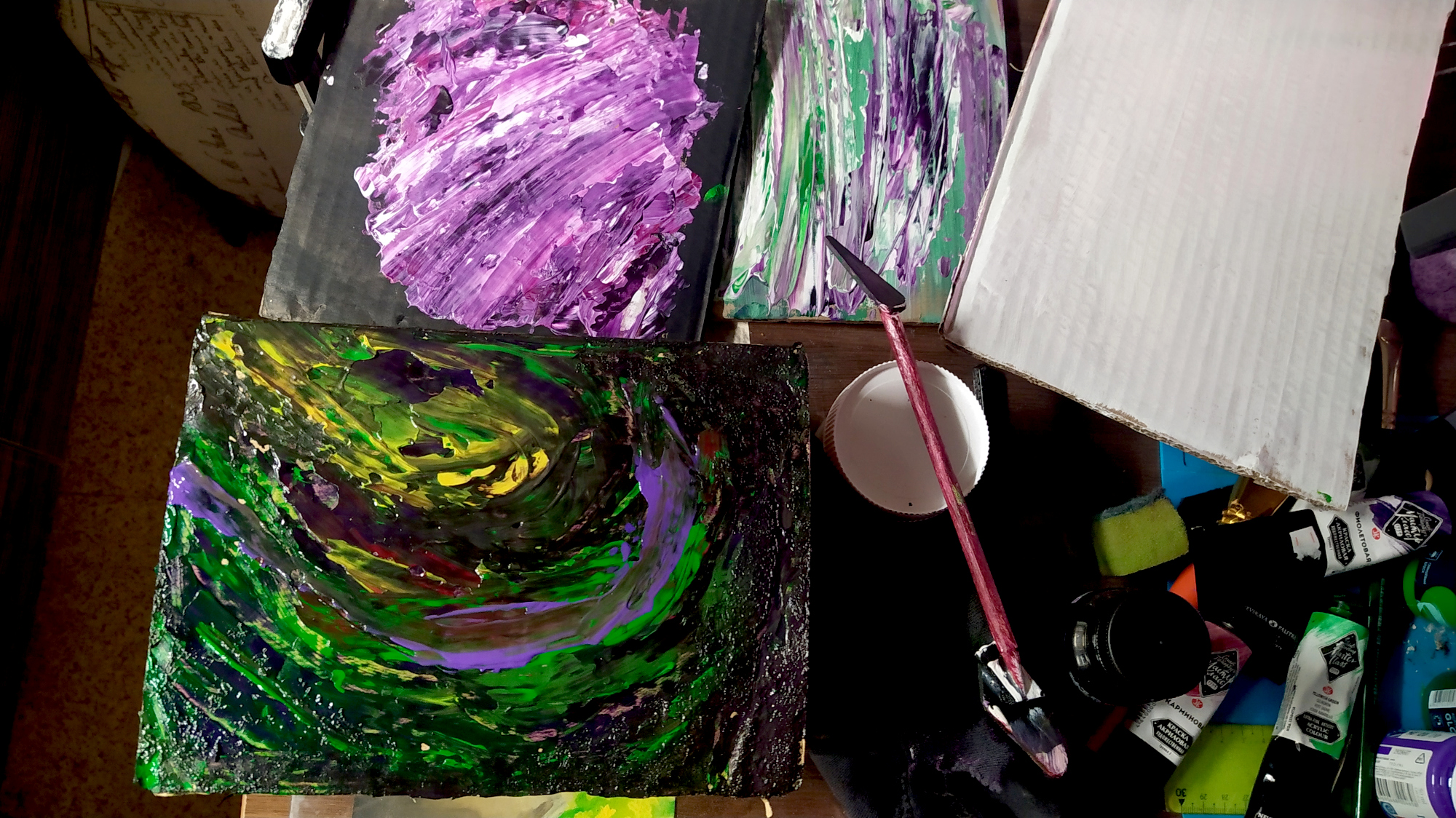 >девочкина история Одна девочка объелась и как хрюшка-чан упала бревном в постель, пытаясь переварить обиду [за обжорство] и содержимое желудка. В голову пришла идея сделать мотивационную надпись на кухне, порочную напоминалку: Кайфожорство как путь в никуда. Набей брюхо, прозябай как свинья.Начала с грунтования холста для надписи, и чтобы не сидеть ждать высыхания, решила поиграть с красками на обрезках картона от этого самого "холста". Результатом довольна! А как фразу и из первоначальной идеи выводить всё ещё не придумала - курочкина лапка у девочки. Могу сделать лишь брутально-честно, но не изящно-красиво. sighСделала мастерок из чего было.
