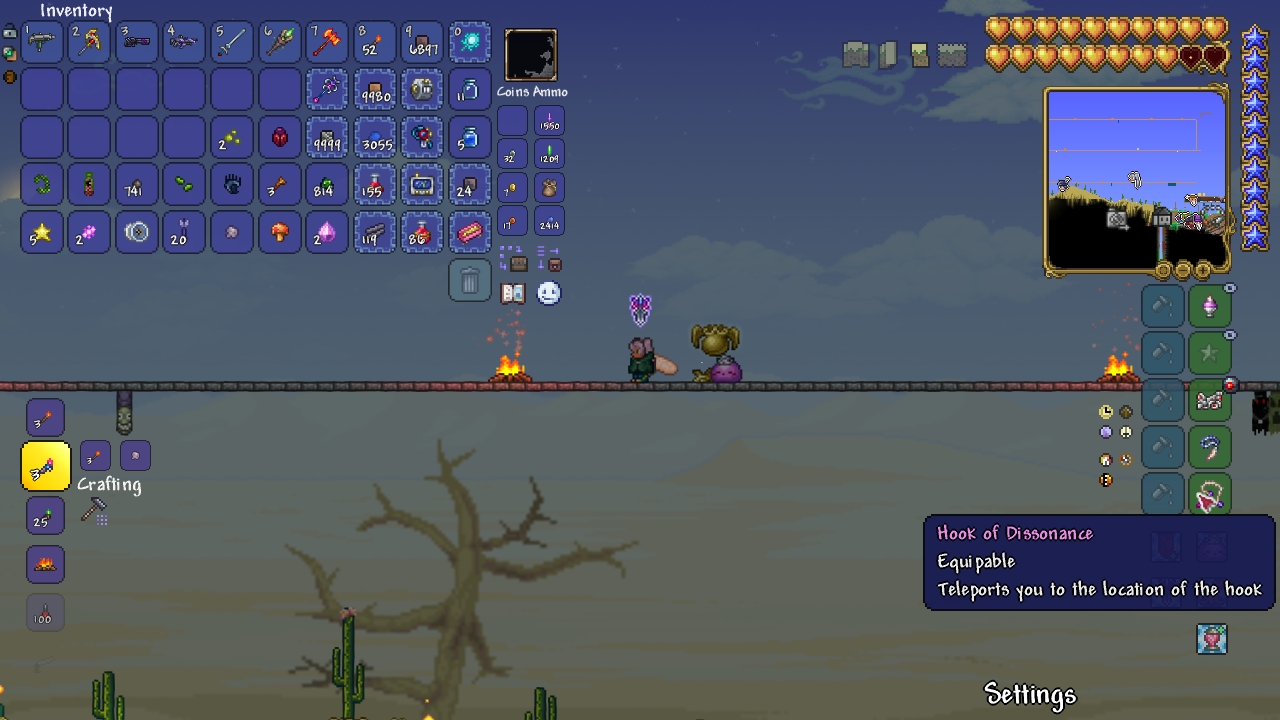 Первый раз била Разрушителя на октрытой арене. Четыре полочки длинной где-то 400 плиток и между ними не знаю сколько, как раз на одно поле зрения при самом отдаленном зуме и разрешении 720р. Била через Dart Rifle и Cursed Dart. Вначале почему-то просела до 50 хп, а потом как-то начала вдумчиво прыгать и уворачиваться и он просто расстаял. Вообще не ожидала, что будет так легко. Уууу! Как же интересно поиграть не так, как всегда!