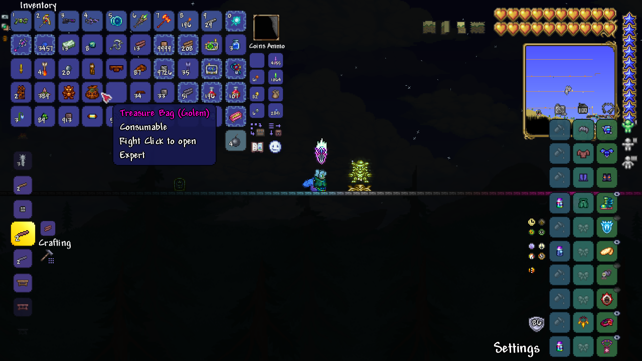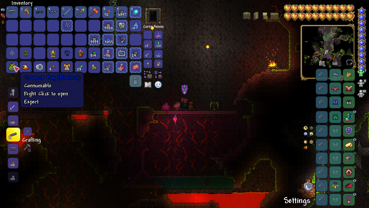 Таки потыкала Queen Slime, в надежде, что ее крюк поможет против глупого салатного растения. А еще посох попался, получше паучка, судя по всему, жаль только одного призвать получается. Правда на салатное растение все никак не соберусь. Не знаю почему. Прокрастинация, что ли. Противный босс. Вторая форма чересчур сильная, я так поняла все копают туннель и там ее тыкают, ну или 10 часов копать большую арену, что бы круги мотать, но она любит исчезать и кисло. 150+ любой атакой это очень больно, учитывая защиту стрелкового сета.