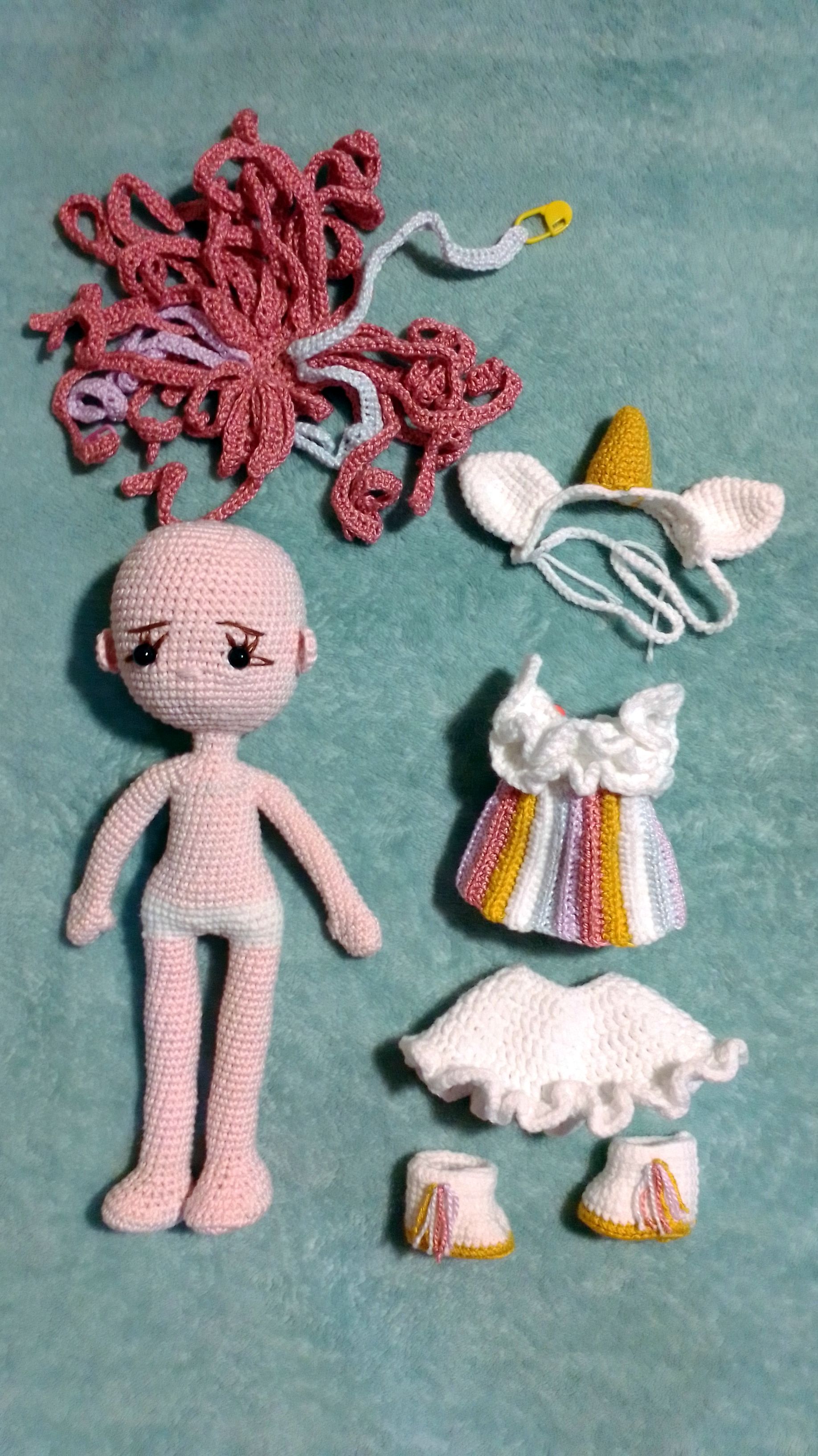 Собрала. Держатся. Нормального света нет, нормальной камеры нет. >>20813Кудряшки из-за конфигурации петелек сами собой закручиваются. Сзади бы "раскудрявить" чуть, но не знаю как. >Разве нельзя на скрытый узелок как-нибудь? Можно, наверное. Но слишком муторно будет. В инструкции клей. Волосы изначально на шкурку от почищенного мандарина похожи. Или на кальмарьи шупальца. Небольшая общая "площадка" на макушке, а от неё "лучи"-локоны. И каждую прядку нужно к голове прикрепить. Связаны крючком большего размера (для "воздушности"), чем всё остальное, поэтому "шаг" петелек не совпадёт с головой, аккуратно не прошить.