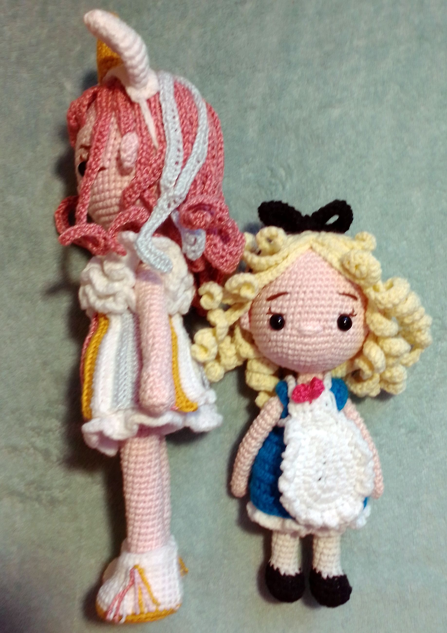 Связала Алису по украденной из интернета схеме. Волосы крепятся на клей. Вроде бы, нужно пользоваться клеевым пистолетом, но у меня его нет, поэтому налепила на Момент-гель. Написано, что сохнет сутки. Надеюсь, что будут держаться (пока пришпилены булавками для надёжности).