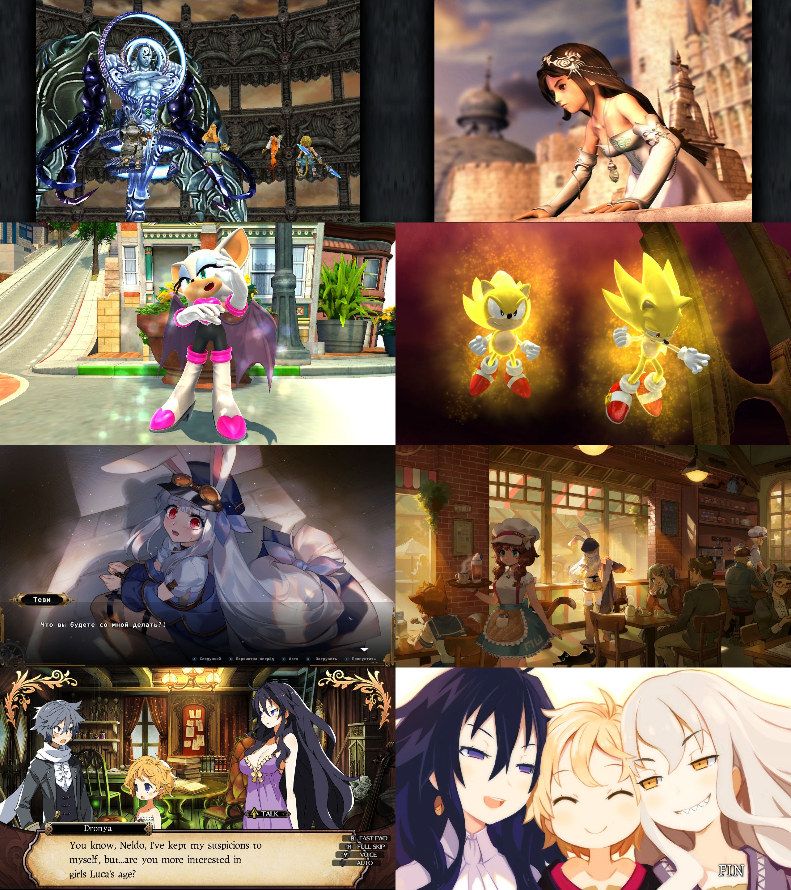 Прошла переиздание девятой Final Fantasy. До последнего не хотела покупать ленивый «ремастер», но всё же не удержалась. Первая jRPG, навсегда в сердечке. Озма побеждён, Могнет Централ запущен. Со сбором всех карточек заморачиваться лениво, как и с ловлей лягух. Оказывается, в детстве пропустила опционального босса! Hades из Мемории. Задники даже на 24-дюймовом 1080p мониторе выглядят мыльно. На 65-дюймовом «4k» телевизоре даже не стала пробовать. Зато в портативном режиме картинка хороша! Уж точно лучше, чем на выгоревшем ЭЛТ-телевизоре, как когда-то. Ремастер Sonic Generations. Пока без «дополнения» про Shadow. Все S-ранги, но на красные кольца и Чао забила. Где собрались, там собрались, где нет — и не нужны. На релизе играла в ворованную на PC, но на дополнительной миссии с Руж, очаровывающей роботов, игра постоянно вылетала. Какой-то баг, зависящий, кажется, от процессора, который тогда так и не починили. Предпоследнего босса я тогда побила, но невозможность пройти всё целиком впечатление испортила. Платформинг местами кривовастенький, но в целом хорошо. https://www.youtube.com/watch?v=MkNBPaNuQ_ghttps://www.youtube.com/watch?v=AtEtQ_Qxsdohttps://www.youtube.com/watch?v=K24oH59sR-8https://www.youtube.com/watch?v=QbU-UEC2vNMTevi. Взяла импульсивно. «О, обложка с кролицей!». Оказалась, что игра от создателей Rabi Ribi. Про Rabi Ribi слышала, хоть и не играла, про Tevi — нет. Хорошая метроидвания. Сюжет с кучей персонажей и озвученными катсценками. Симпатичные спрайты, запоминающиеся локации, неплохой саундтрек. Целая гора (у меня было больше двух сотен, и я не уверена, что собрала все) «сигилов» для экипировки (по типу амулетов из Hollow Knight). Играла на Hard’е. Поначалу какая-то сложность ощущается (пиком была схватка со львом), но дальше «раскачиваешься» и большинство последующих боссов проходятся с первого раза танкованием и закликиванием без особого менджмента тех же сигилов. Полагаю, что на сложностях выше такой проблемы нет. Но играется очень весело. После прохождения открывается ещё один уровень сложности (изначально даже Hard не самый высокий). Изначально есть какой-то режим для спидранеров с отклюёнными сюжетными сценками и возможностью sequense braking’а. https://www.youtube.com/watch?v=XF5UWtaS_Rohttps://www.youtube.com/watch?v=6DY6qa0fFgEhttps://www.youtube.com/watch?v=J6LFXScq2SULabyrinth of Refrain. Хорошо. История и персонажи отличные. Но в плане геймплея сильно проще сиквела. Дизайн подземелий ощущается не таким изобретательным, многих возможностей ещё нет. Никаких тебе ядовитых луж, по которым интересно «Смогу или нет?»-добежать куда-нибудь. Прыжков нет, перемещения под водой нет, «самодвижущихся» полов нет, секций с рандомной генерацией лабиринта нет. Много чего нет. Профессий в два с лишним раза меньше, механика наследования скиллов не такая интересная, как в продолжении, боёвка проще. Хорошо, но после потрясающей Galleria несколько пресновато.